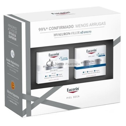 Eucerin Hyaluron Filler doboz segítségével, amelyet kifejezetten száraz bőrre terveztek. Ez a teljes körű bőrápoló készlet nappali és éjszakai krémet tartalmaz, mindkettő intenzív hidratálást biztosít és harcol az öregedés jelei ellen.