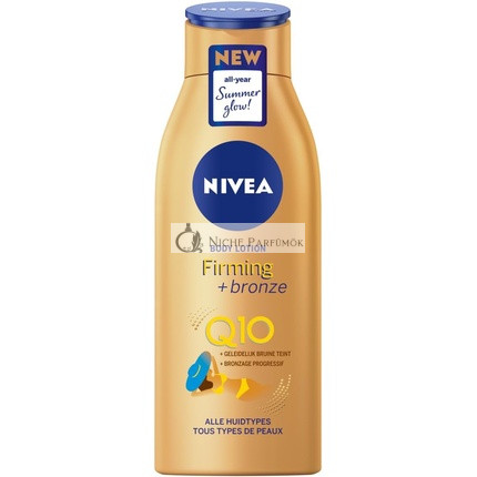 Nivea Q10 Firming Body Lotion és Bronzosító a tökéletes megoldás mindenkinek, aki gyönyörűen bronzos és feszes bőrt szeretne elérni. Ez a luxus testápoló a Q10 erejét egy kis bronzosítással ötvözi, hogy bőre természetes ragyogást kapjon.
