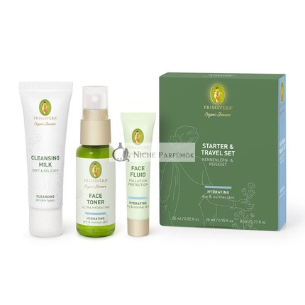 PRIMAVERA Hidratáló Kezdő és Utazó Készletet, amelyet normál és száraz bőrre terveztek. Ez a vegán bőrápoló ajándékdoboz tökéletes azok számára, akik szeretnék megőrizni bőrük egészségét útközben.